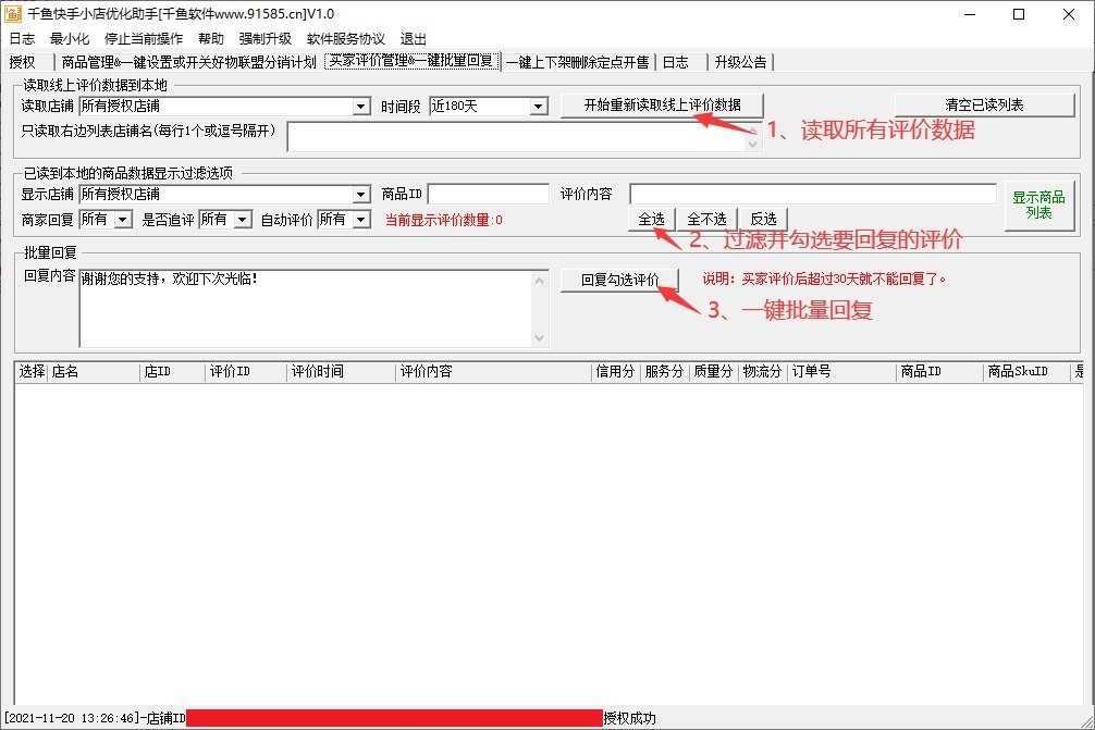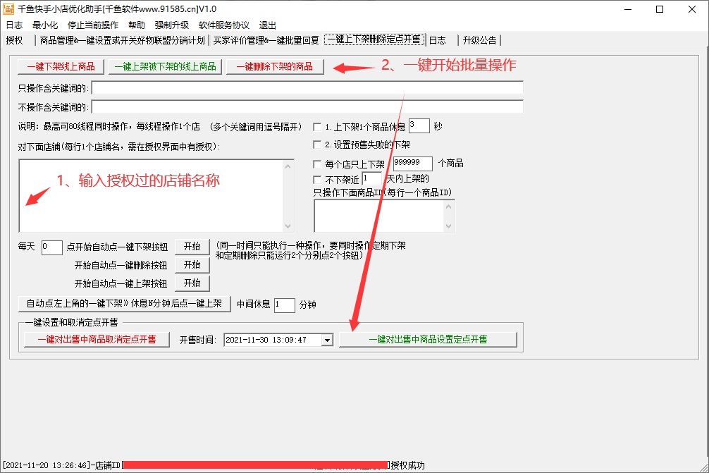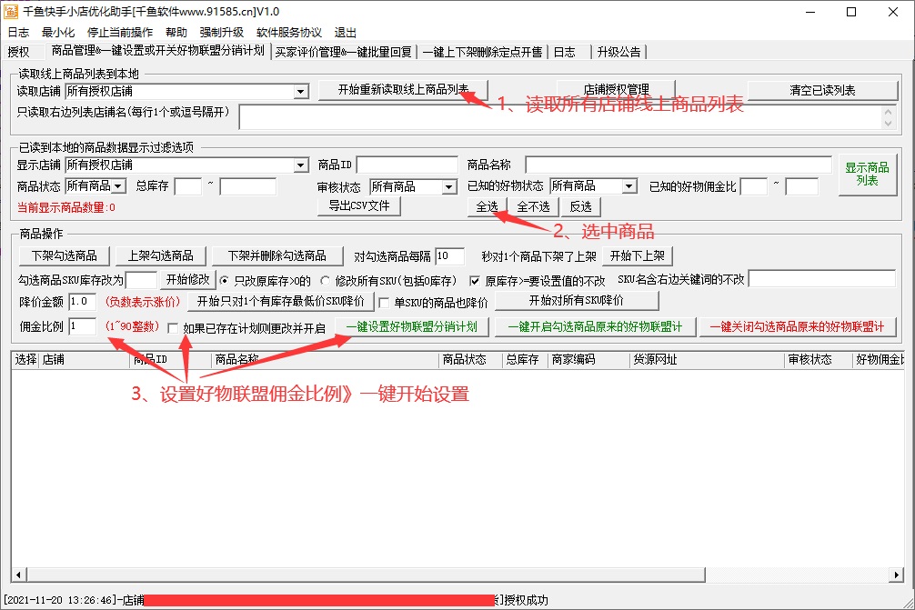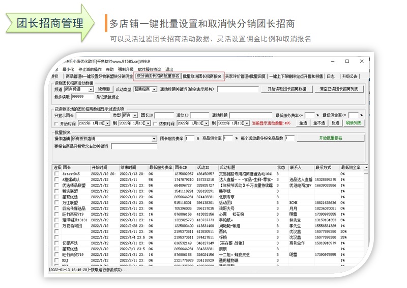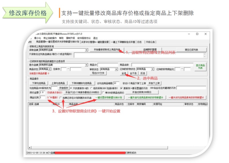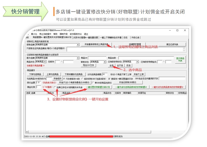 本软件为[千鱼软件www.917e.com]自主开发,可以让快手小店商家一键批量设置修改多店铺商品快分销(好物联盟)佣金、一键批量报名和取消报名团长招商活动、一键回复买家评价、一键商品上下架改定点开售库存价格等。