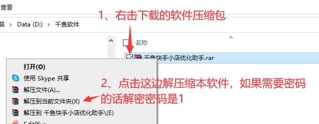 2. 解压缩:右键点击“千鱼快手小店优化助手.rar“,左键点击”释放/解压到这里“