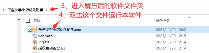 3. 双击解压后的目录“千鱼快手小店优化助手“进入,并双击“千鱼快手小店优化助手”运行本软件