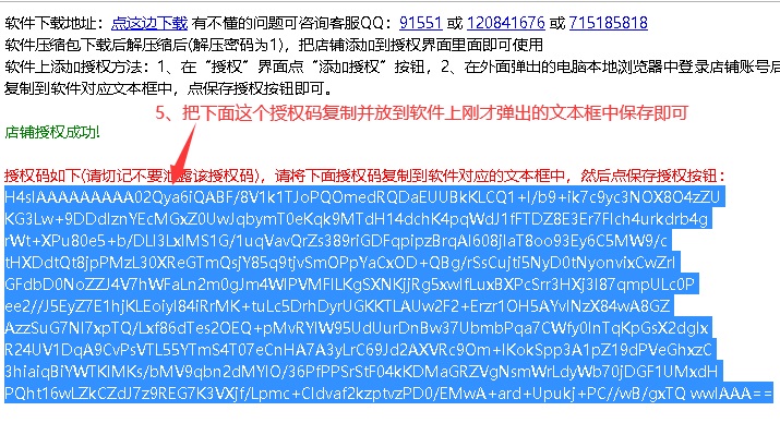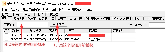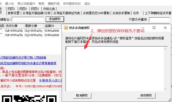 第一步:点软件“授权”界面的“添加授权”按钮,可以在左边写一下店铺备注,点击后软件会弹出一个授权码输入框(先不要动),同时自动用外面电脑本机的浏览器打开登录页面》在上面登录你要授权的店铺》点授权登录。
